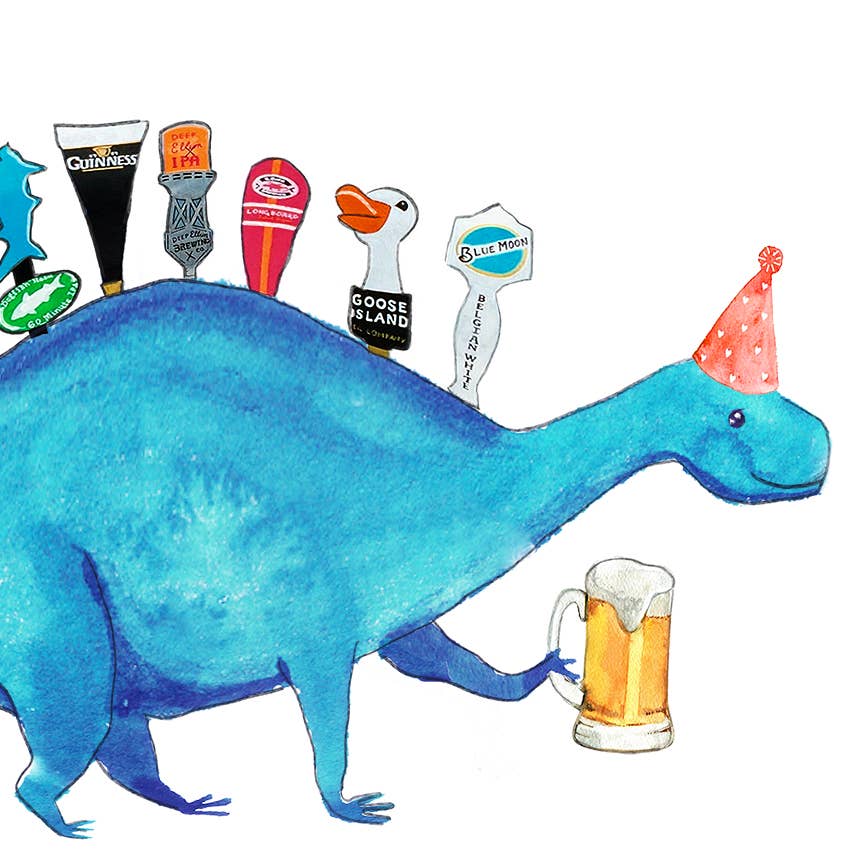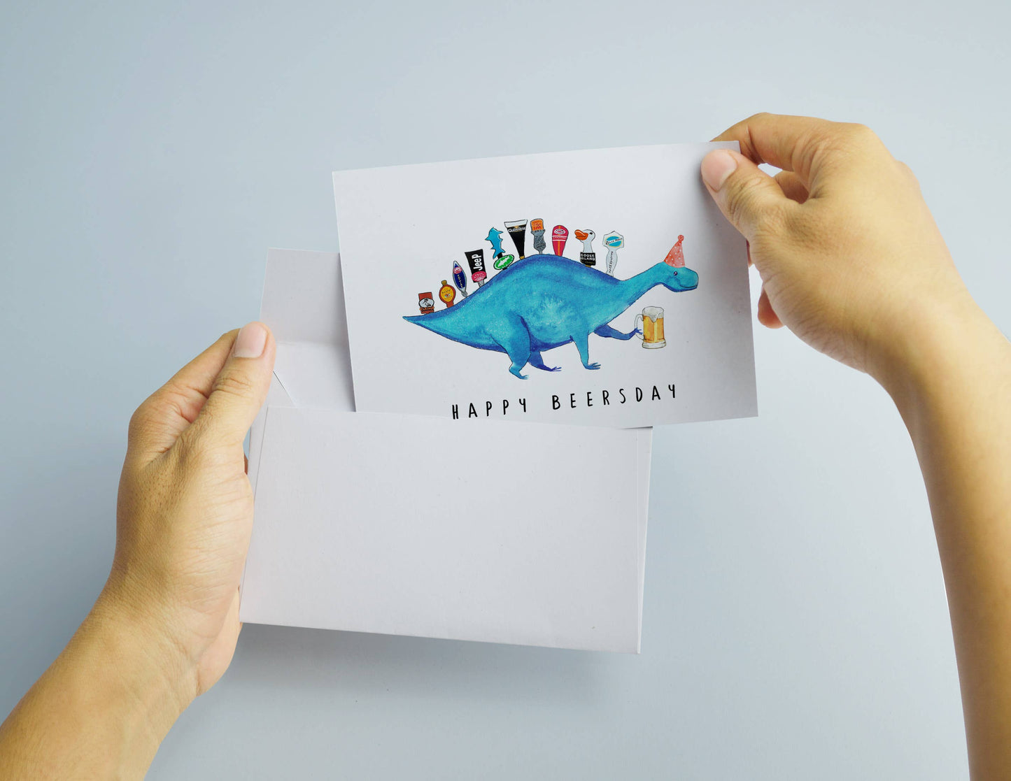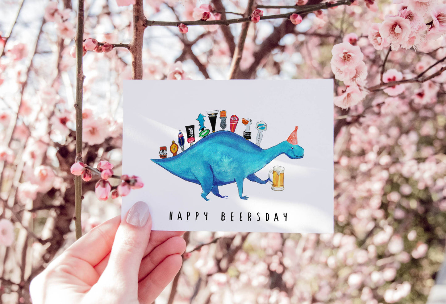 "Happy Beersday" from your beer tap dinosaur. This funny beer birthday card is perfect for your craft beer lover friends and family. Also applies to any day besides birthday because everyday could be your beers-day -A2 size (4.25" x 5.5"), blank inside -120lb extreme heavyweight FSC-certified paper -Single card & envelope packed in a clear cello bag -Handmade by the artist in Berkeley, California, USA