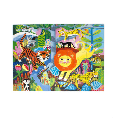 The artist Linda Bleck has filled this large 20-piece puzzle with cats of all sizes and stripes: tiger, lion, leopard, cheetah, and more! These cats cavort in a vibrant landscape, reminding us of the variety and grandeur of big cats from around the world.