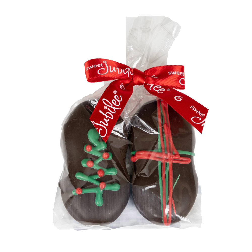 Nutter Butter Cookies Covered in Rich Dark Chocolate and Hand Decorated in a Small, Clear Cello Gift Bag with a Red Signature Bow.