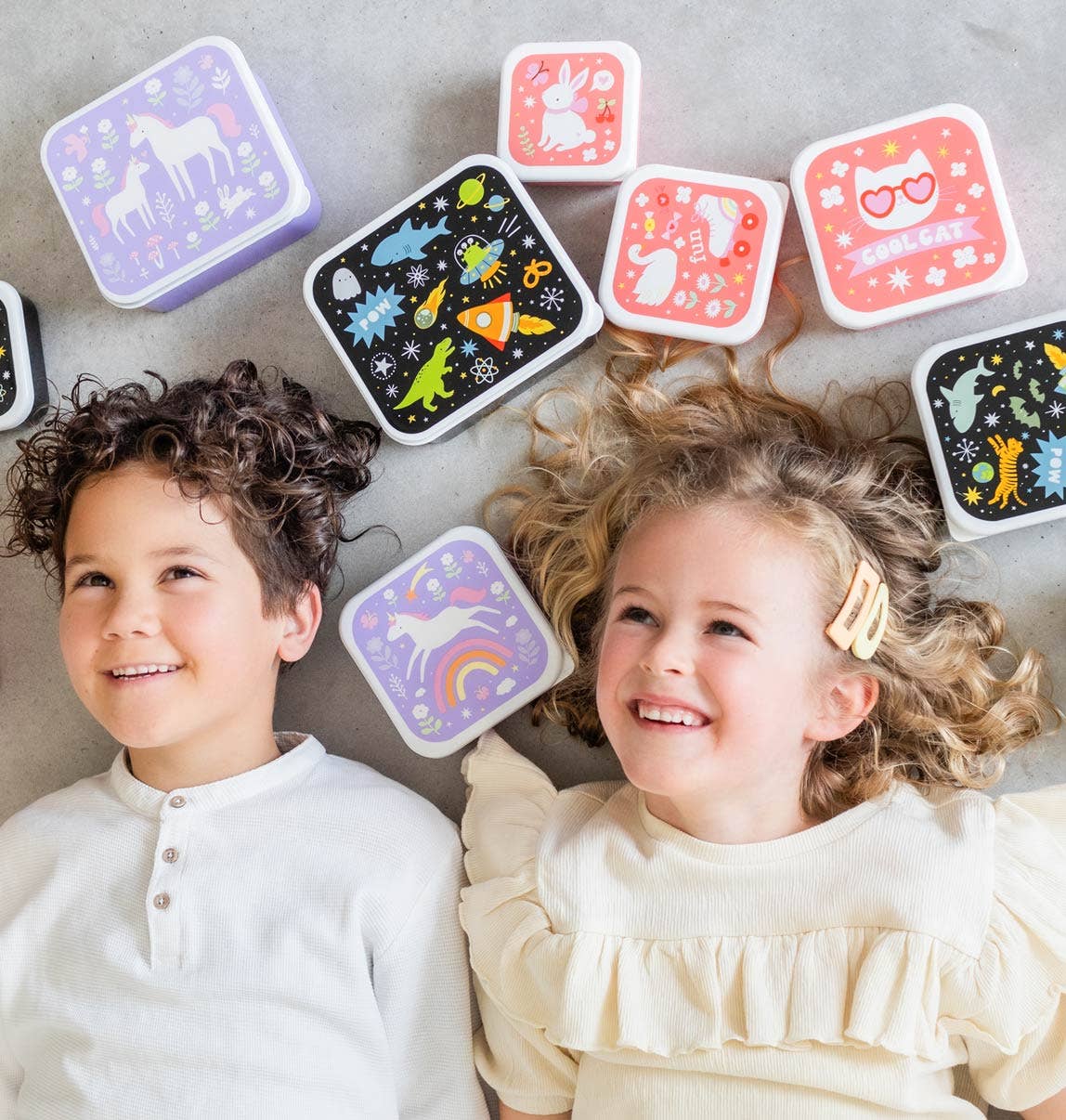 Set of four lunch and snack boxes in different sizes and matching designs. Great for school, on the go, and ideal for home snacks and storage. The little lip on the side of the lid makes them easy to open and close and the boxes stack inside each other for efficient storage. Please note: the lunch & snack box set is not suitable for the dishwasher or microwave. We also recommend you wash all containers in warm soapy water before first use. Specifications: • Contents: 4 containers • Dimensions: lunch box - 6.2 x 5.5 x 2.8 inches/15.8 x 14 x 7 cm large snack box - 4.7 x 4.7 x 2.2 inches/12 x 12 x 5.5 cm medium snack box - 4.1 x 4.1 x 2 inches/10.5 x 10.5 x 5 cm small snack box - 3.5 x 3.5 x 1.8 inches/9 x 9 x 4.5 cm • Material: BPA free PP • Not suitable for the dishwasher or microwave.