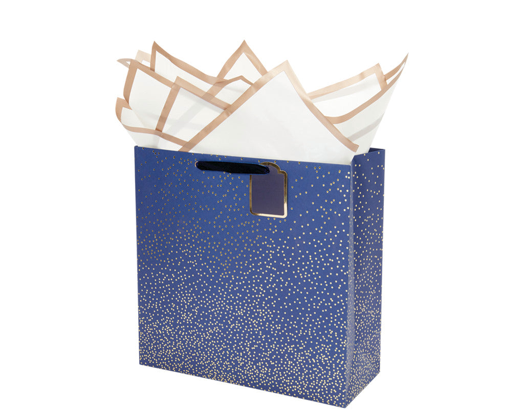 Foil Design, premium ribbon handle, interior print, with 3 sheets of premium metallic edge tissue.